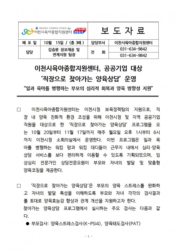 보도자료 | [보도자료] 이천시육아종합지원센터, 공공기업 대상 직장으로 찾아가는 양육상담 운영