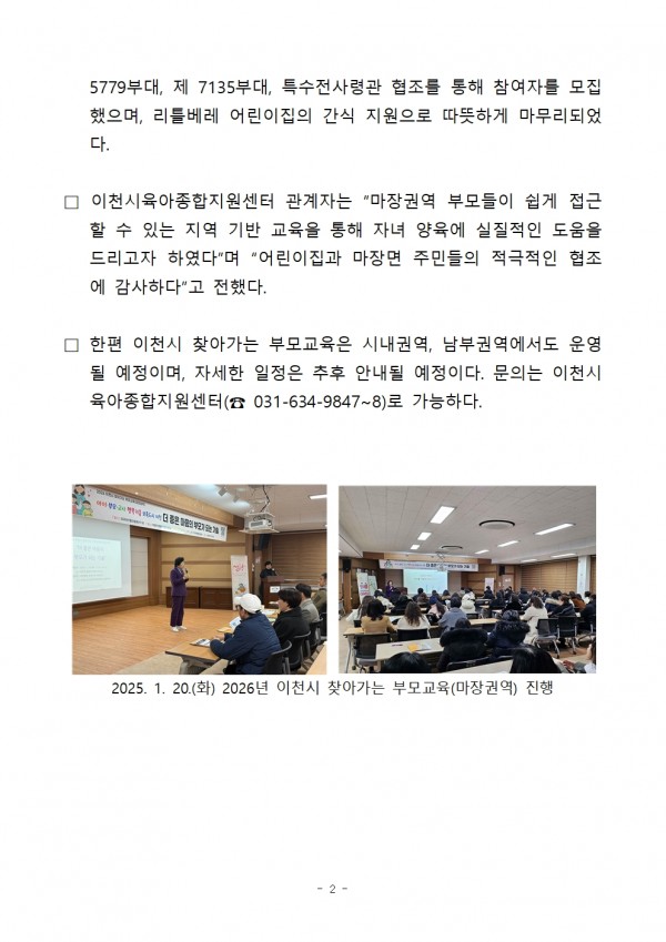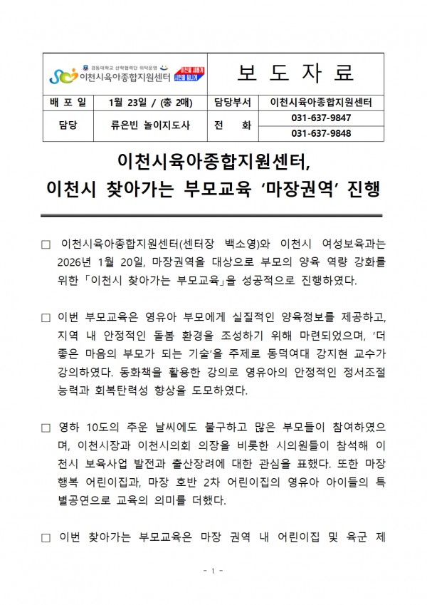 보도자료 | [보도자료] 이천시육아종합지원센터, 이천시 찾아가는 부모교육 '마장권역' 진행