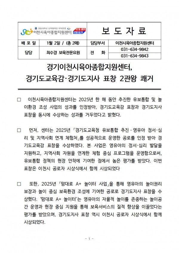 보도자료 | [보도자료]경기이천시육아종합지원센터, 경기도교육감·경기도지사 표창 2관왕 쾌거