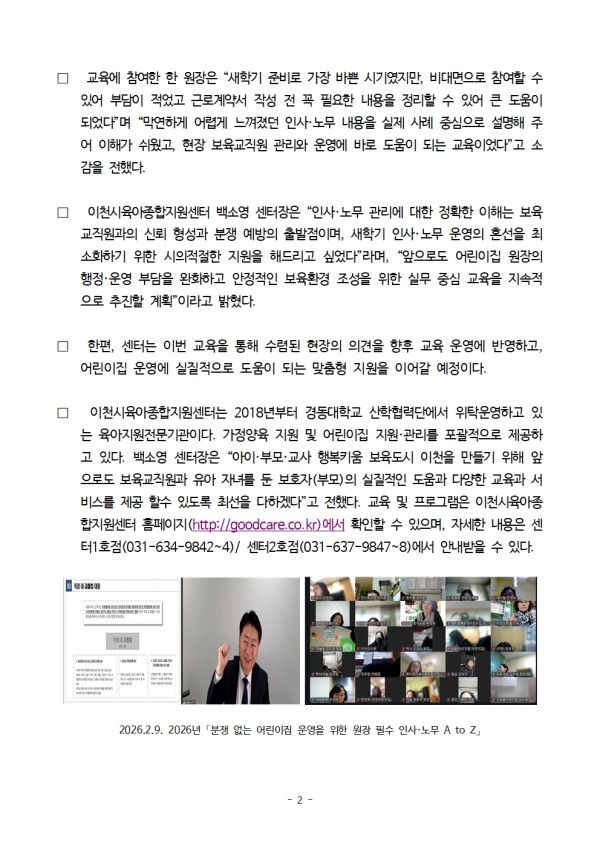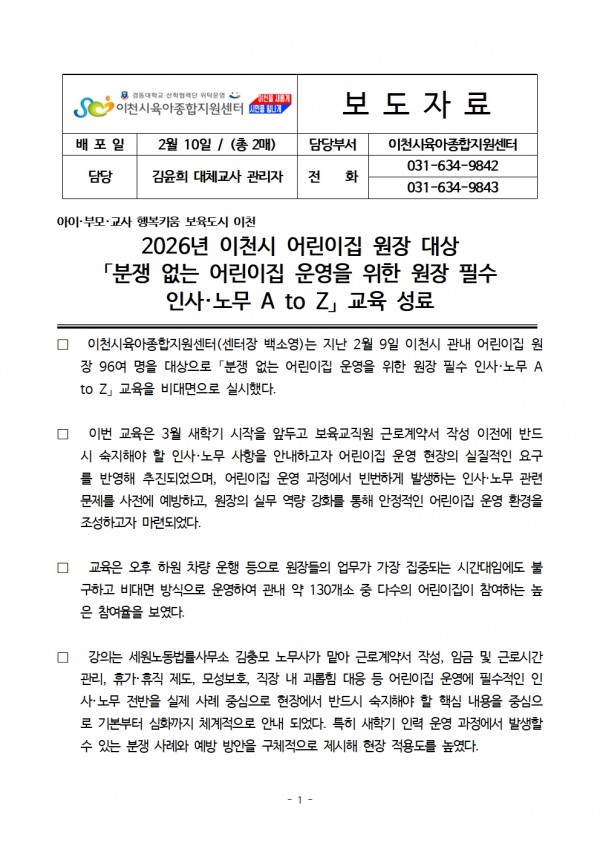 보도자료 | 2026년 이천시 어린이집 원장 대상 분쟁 없는 어린이집 운영을 위한 원장 필수 인사·노무 A to Z 교육 성료
