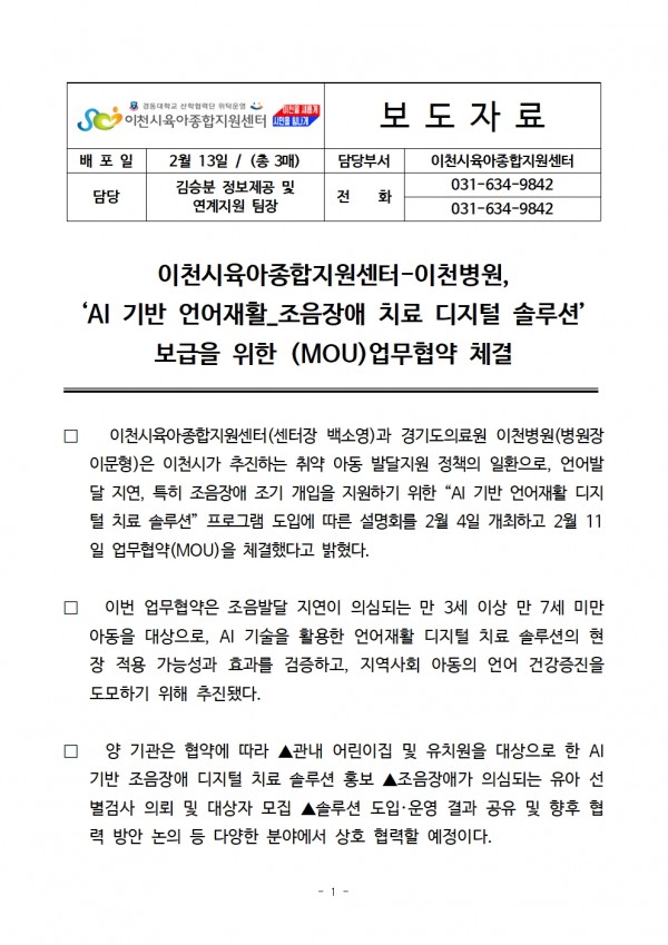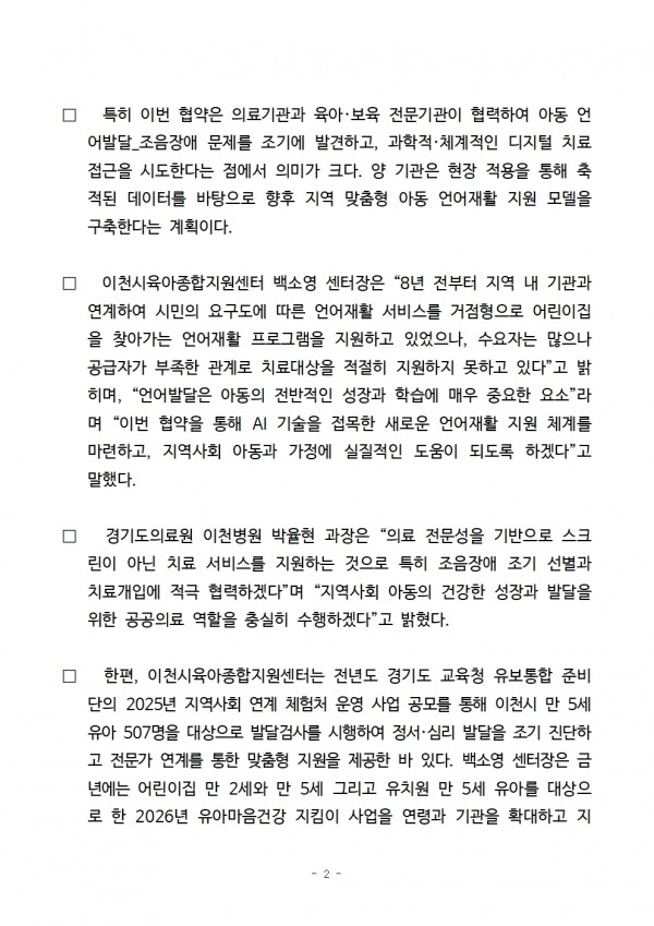 보도자료 | 이천시육아종합지원센터-이천병원, 'AI 기반 언어재활_조음장애 디지털 솔루션' 보급을 위한 (MOU)업무협약 체결