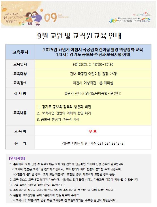 | 장소 | 이천시 여성회관 3층 회의실 | 대상 | 관내 국공립 어린이집 원장 |