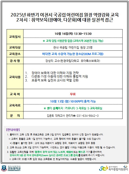 [비대면]2025년 하반기 이천시 국공립 어린이집 원장 역량강화 교육 2차시 : 취약보육(장애아, 다문화)에 대한 실천적 접근