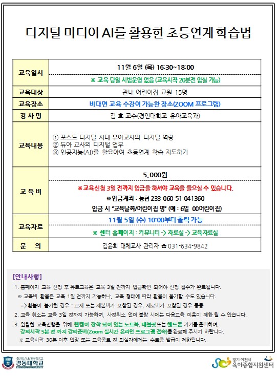 | 장소 | 비대면 교육 수강이 가능한 장소(ZOOM 프로그램) | 대상 | 관내 어린이집 교원 |