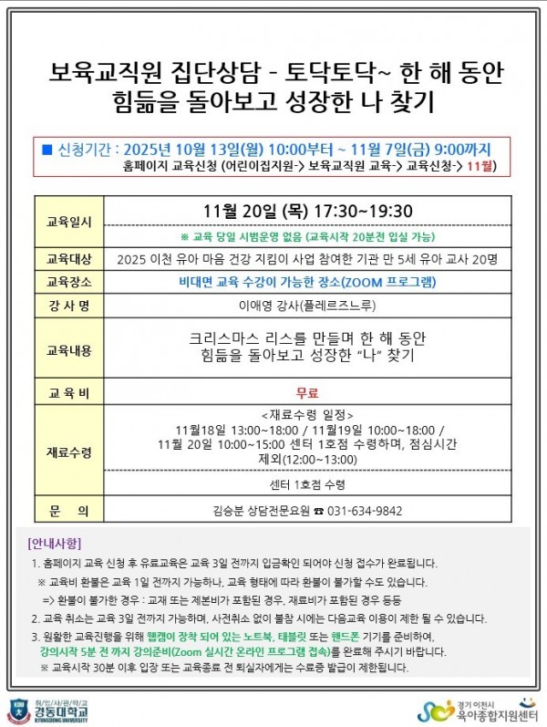 안녕하세요. 교육청 지원사업 2025 이천 유아 마음 건강 지킴이 사업에 참여해 주신 어린이집 원장님과 선생님께 감사드리며, 선생님들의 정서.심리를 돕고자 집단상담 프로그램을 준비하였습니다.