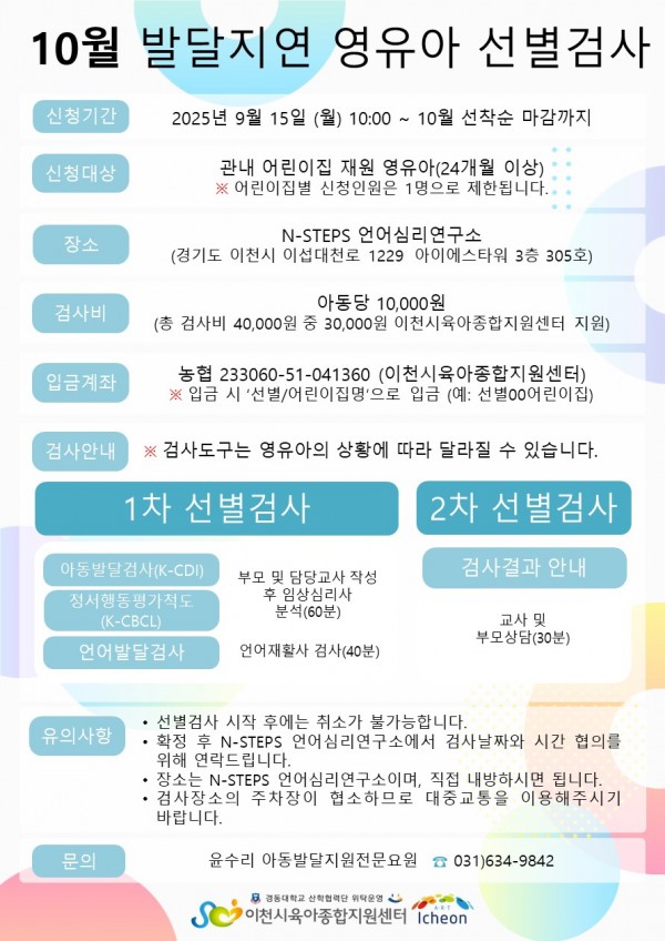 | 장소 | N-STEPS 언어심리연구소(이섭대천로 1229 아이에스타워 3층 305호) | 대상 | 관내 어린이집 재원 영유아(24개월 이상) |