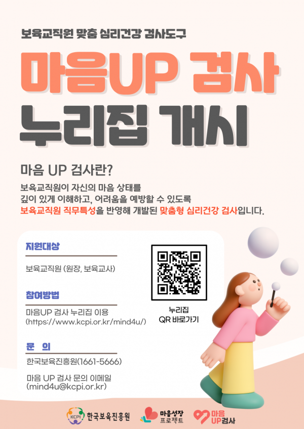 *안내문 큐알을 통해 마음up검사를 실시해 주세요.->한국보육진흥원 ->로그인 -> 누리집 검사실시 ->마이페이지->검사결과 열람 또는 출력 ->센터 상담요청