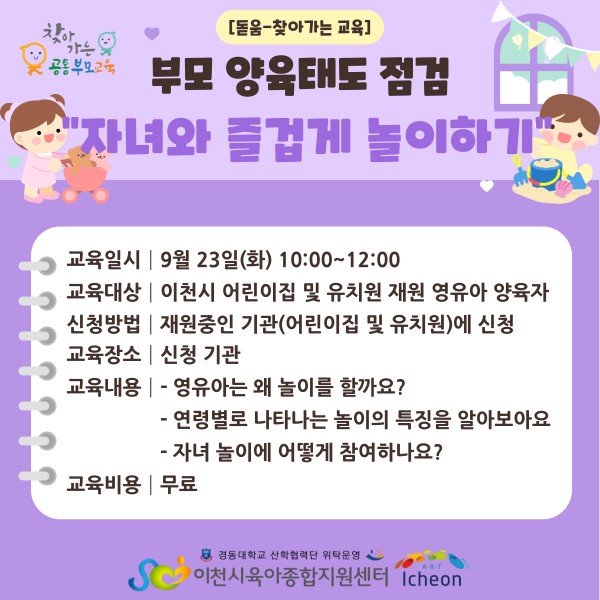 | 장소 | 신청기관(어린이집 및 유치원) | 대상 | 이천시 어린이집 및 유치원 재원 영유아 양육자 |
