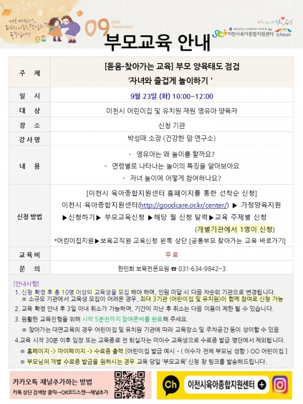 본 교육은 대면으로 진행되며어린이집 및 유치원 원장님께서 신청 후 기관 내 부모님 참여 교육입니다.