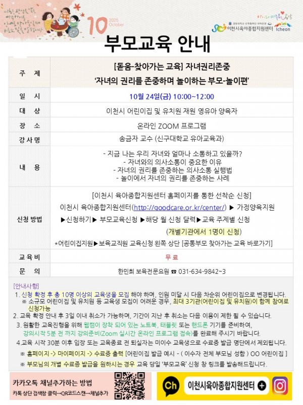 본 교육은 어린이집 및 유치원 원장님께서 신청 후 기관 내 부모님 참여 교육입니다.