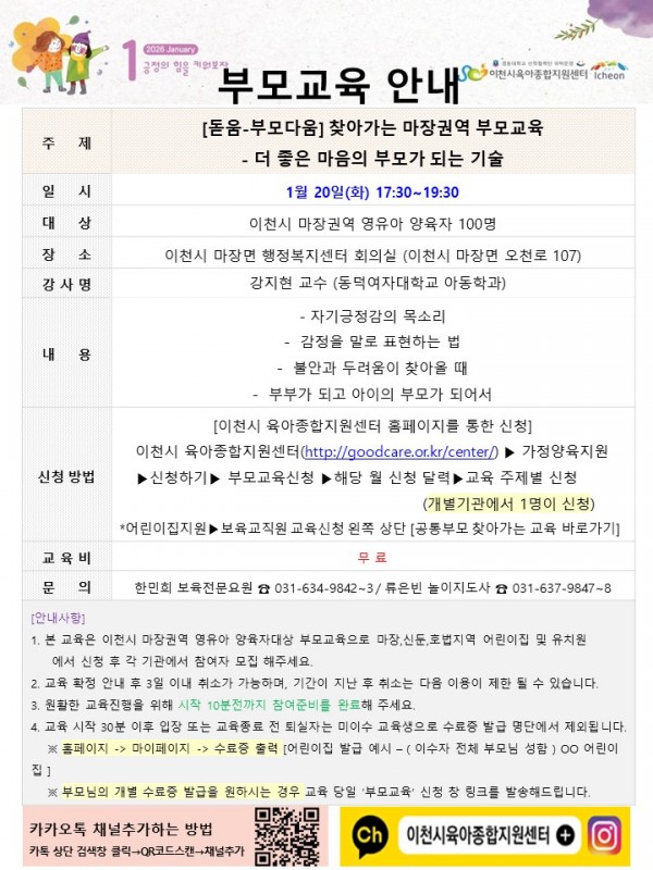| 장소 | 이천시 마장면 행정복지센터 회의실 | 대상 | 이천시 마장권역 영유아 양육자 80명 |