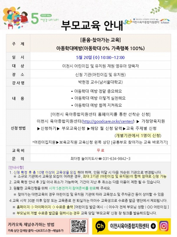 본 교육은 어린이집 및 유치원 원장님께서 신청 후 기관 내 부모님 참여 교육입니다.