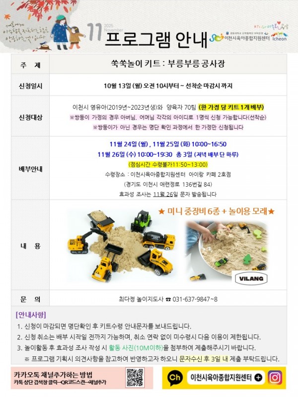 * 이천시 2~5세(2019년~2023년생) 영유아 대상으로 배부합니다(가정당 키트 1개)