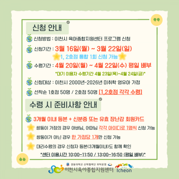 | 대상 | 이천시 관내 영유아(2020년~2026년생) | 정원 | 50명 |