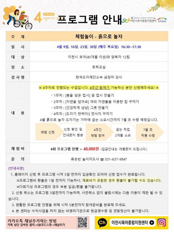 * 4월 9일, 16일, 23일, 30일 (매주 목요일) 4주로 진행이 됩니다