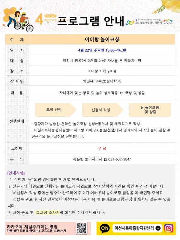 | 대상 | 이천시 영유아(12개월 이상) 자녀를 둔 양육자 | 정원 | 1명 |
