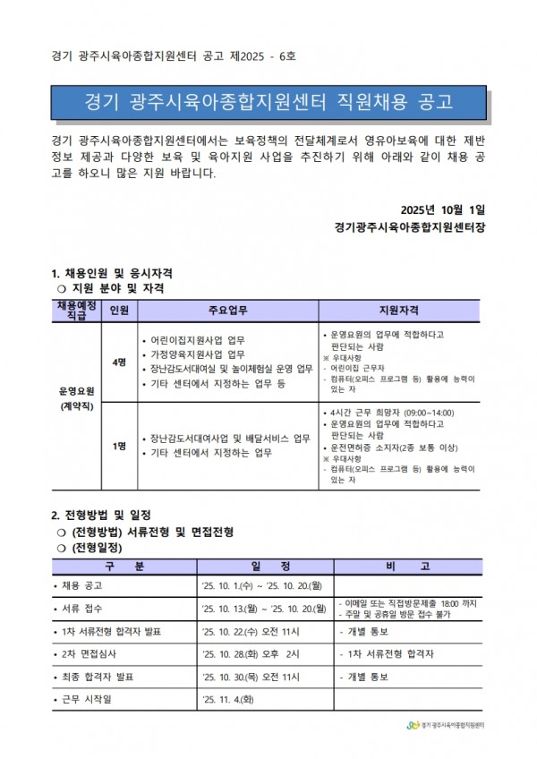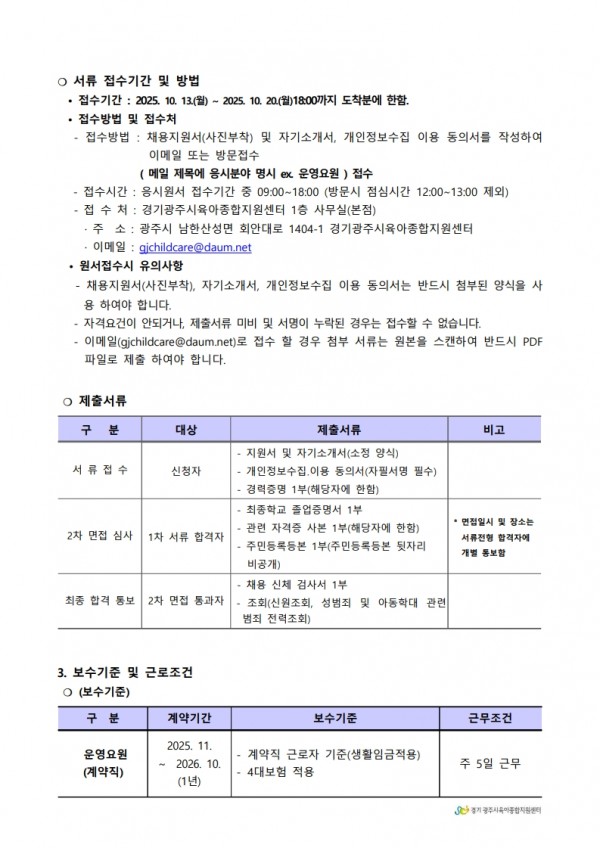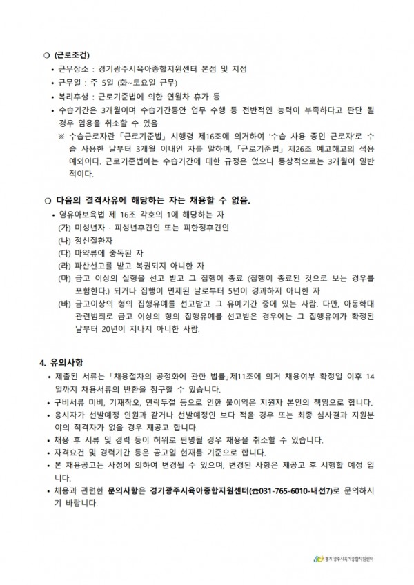 유관기관 | 경기광주시육아종합지원센터 직원채용 공고