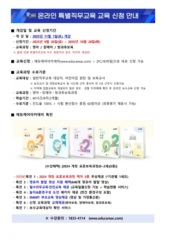 보수교육 | [에듀케어 아카데미] 온라인 특별직무교육 11월 개강반 교육 안내 페이지 정보 작성자 이천센터 작성일25-10-02 10:24 조회30회 댓글0건 첨부파일 붙임_에듀케어아카데미_온라인_특별직무교육_11월 개강반_교육신청_안내문_1.jpg (401.3K) 1회 다운로드 DATE : 2025-10-02 10:24:15 관련링크 이전글 다음글 목록 본문 . 이전글 다음글 목록