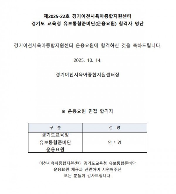 센터 | 제2025-22호 경기이천시육아종합지원센터 경기도교육청 유보통합준비단 운용요원 합격자 공지 페이지 정보 작성자 이천센터 작성일25-10-14 16:08 조회61회 댓글0건 첨부파일 홈페이지 공지 내용_공고2025-22호.JPG (43.2K) 3회 다운로드 DATE : 2025-10-14 16:08:17 관련링크 이전글 다음글 목록 본문 . 이전글 다음글 목록