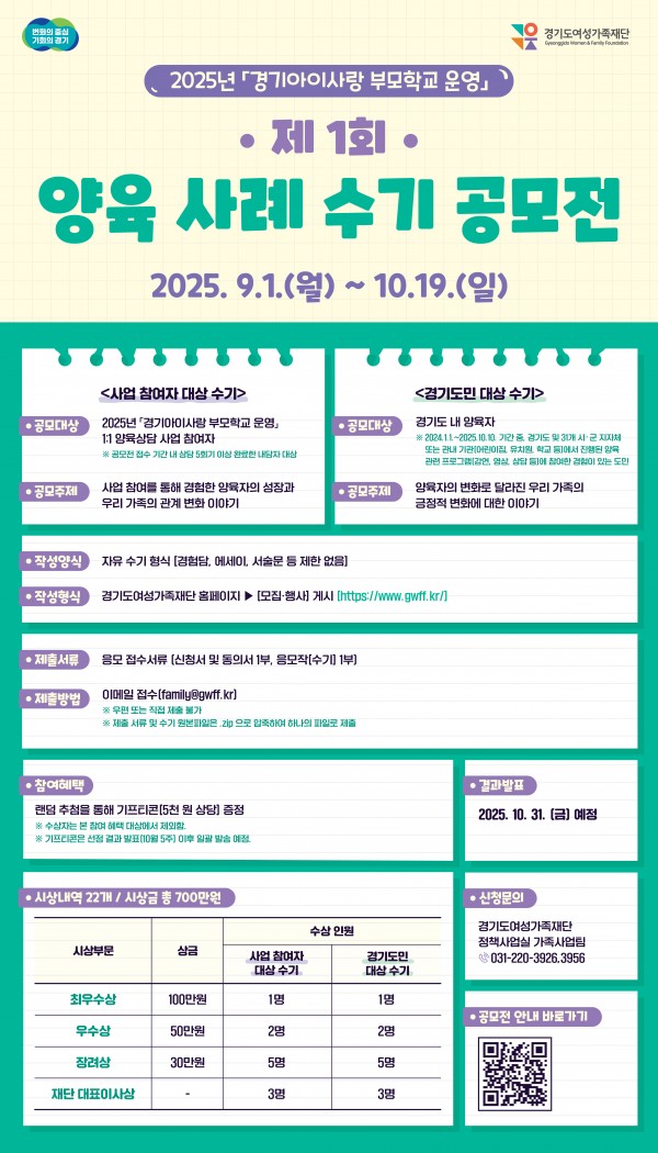 유관기관 | [경기도여성가족재단] 2025년「경기아이사랑 부모학교 운영」제 1회 양육 사례 수기 공모전 안내