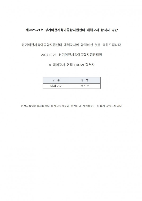 센터 | 제2025-21호 경기이천시육아종합지원센터 대체교사 합격자 명단 페이지 정보 작성자 이천센터 작성일25-10-23 10:36 조회15회 댓글0건 첨부파일 제2025-21호 경기이천시육아종합지원센터 대체교사 합격자 명단005.jpg (153.6K) 0회 다운로드 DATE : 2025-10-23 10:36:46 관련링크 다음글 목록 본문 . 다음글 목록