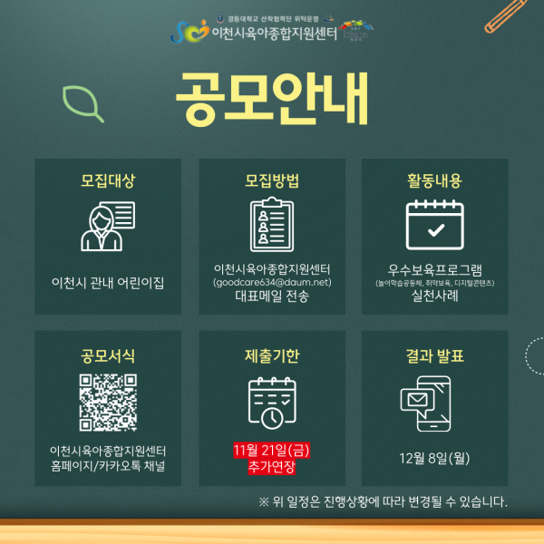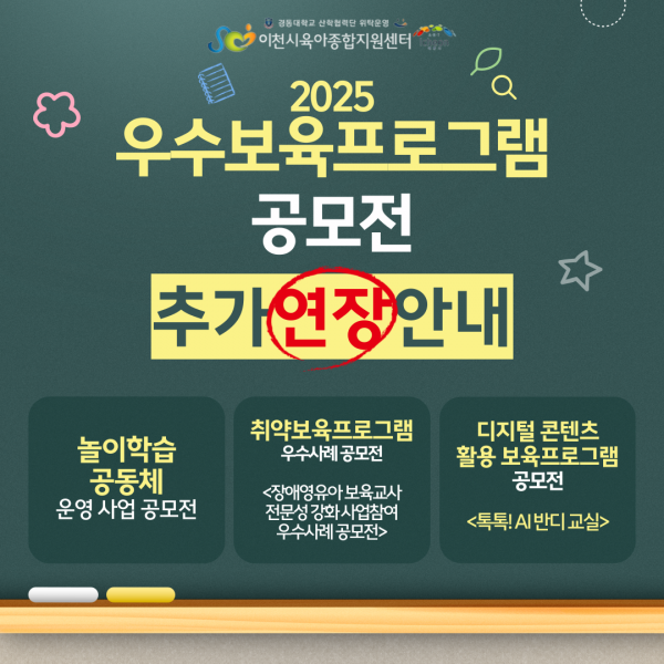 2025 이천시 우수보육프로그램 공모전의 참여대상이 확대됨에 따라, 접수기한이 추가연장(~11. 21. (금))되어 안내드리오니, 아래 내용 확인 후 많은 참여 부탁드립니다.