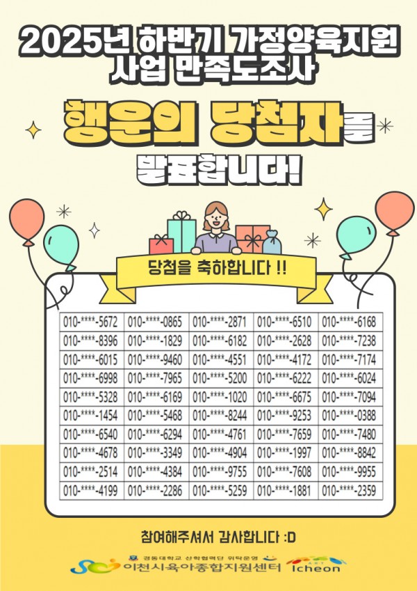 센터 | ! 당첨자 안내 ! (2025년 하반기 가정양육지원사업 만족도 및 요구도 조사)