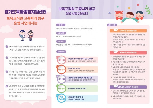 경기도육아종합지원센터에서는 경기도 내 보육교직원의 권리보호 및 권리증진을 위해「보육교직원 고충처리 창구 운영」사업을 운영하고 있으며, 고충 상담을 안내하고 있습니다.