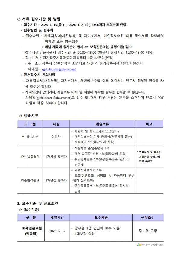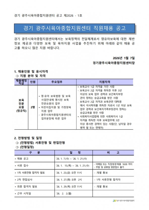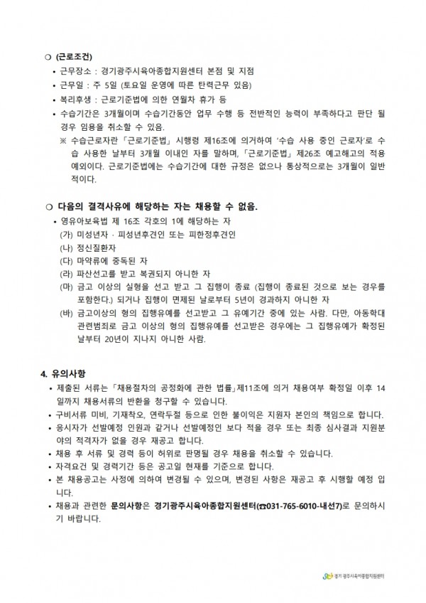 유관기관 | 경기 광주시육아종합지원센터 직원 채용 공고 1호