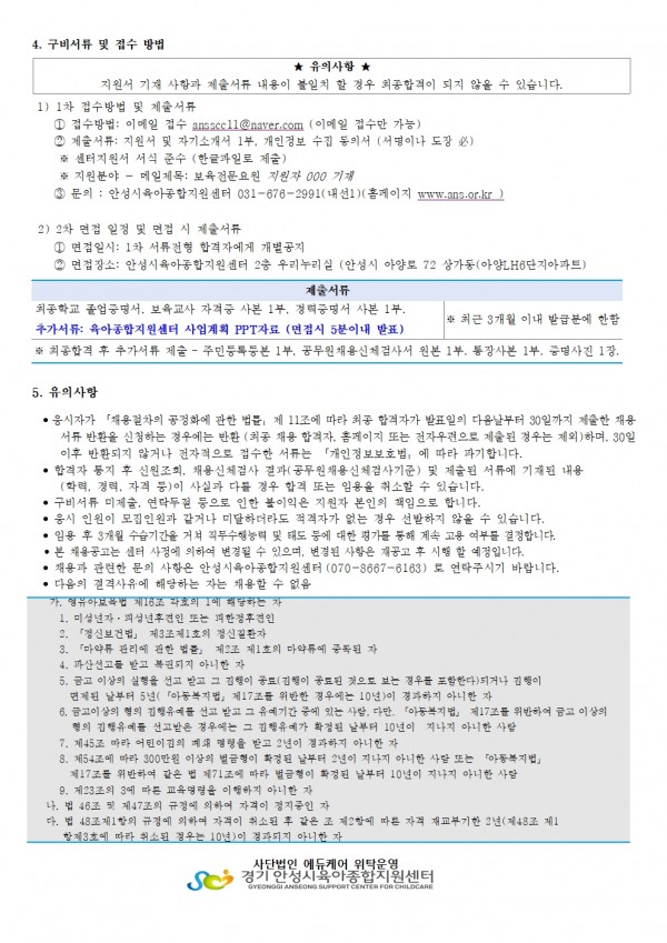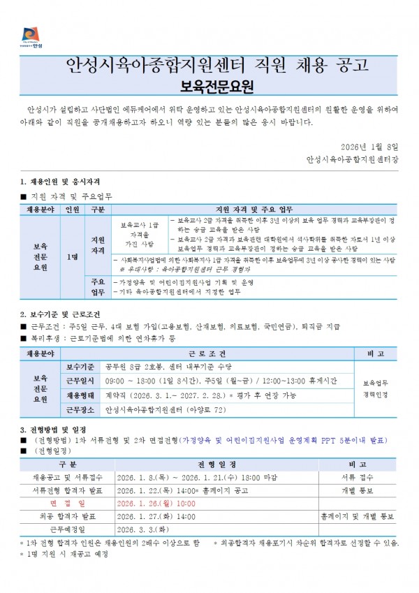 유관기관 | 경기 안성시육아종합지원센터 보육전문요원 채용 공고