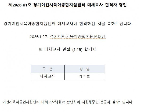 센터 | 제2026-01호 경기이천시육아종합지원센터 대체교사 합격자 명단