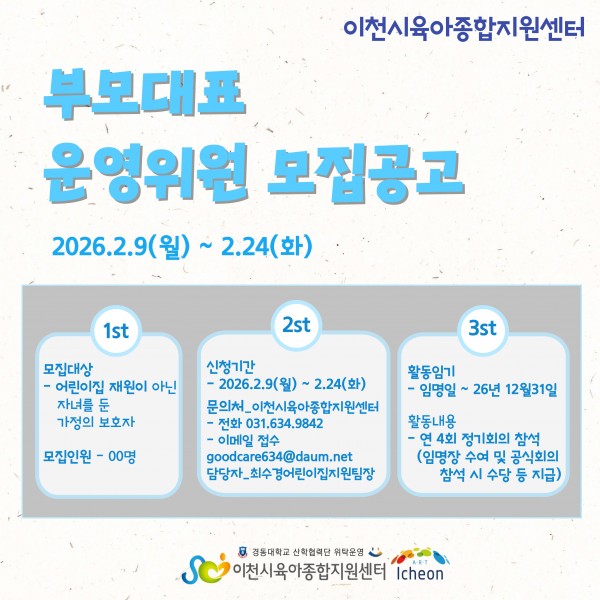 센터 | 2026년 이천시육아종합지원센터 부모대표(어린이집 미이용) 운영위원 모집 공고