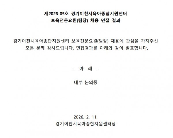 센터 | 제2026-05호 경기이천시육아종합지원센터 보육전문요원(팀장) 합격자 명단