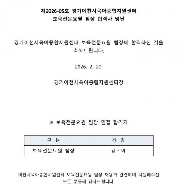 센터 | 제2026-05호 경기이천시육아종합지원센터 보육전문요원(팀장) 합격자 명단