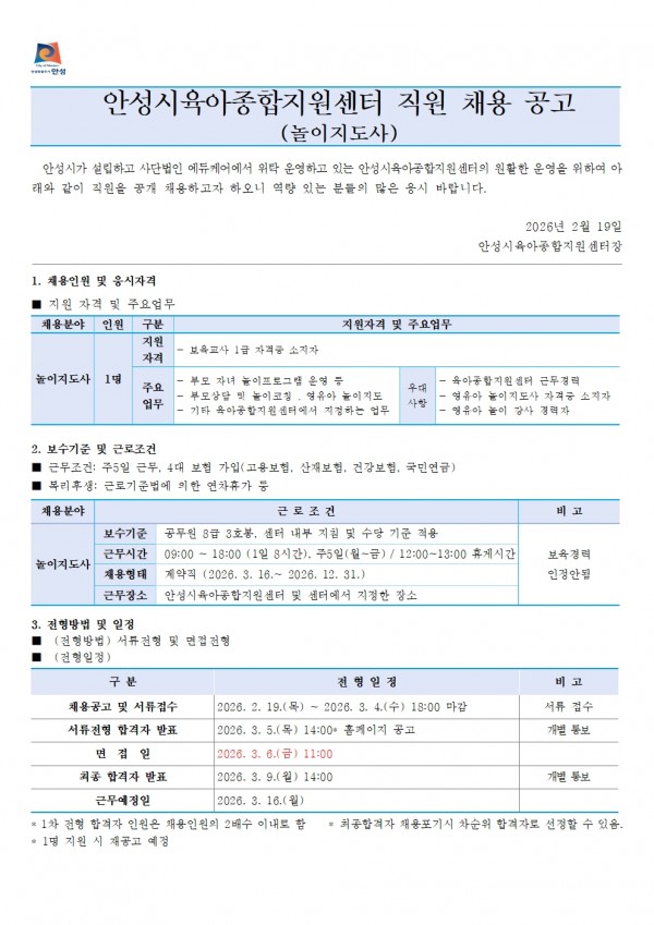 유관기관 | 안성시육아종합지원센터 직원 채용 공고(놀이지도사)