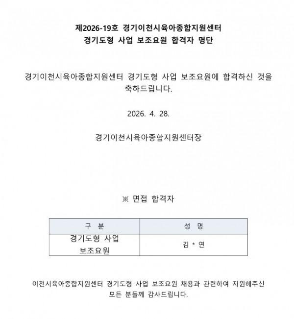 센터 | 제2026-19호 경기이천시육아종합지원센터 경기도형 사업 보조요원 합격자 명단