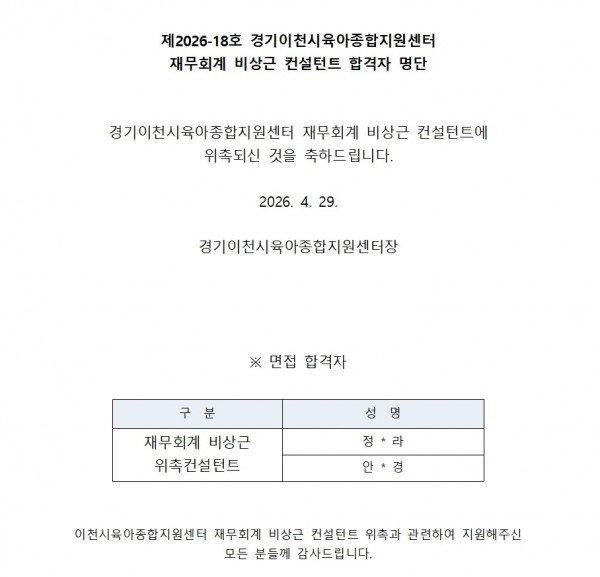 센터 | 제2026-18호 경기이천시육아종합지원센터 비상근 컨설턴트 합격자 명단