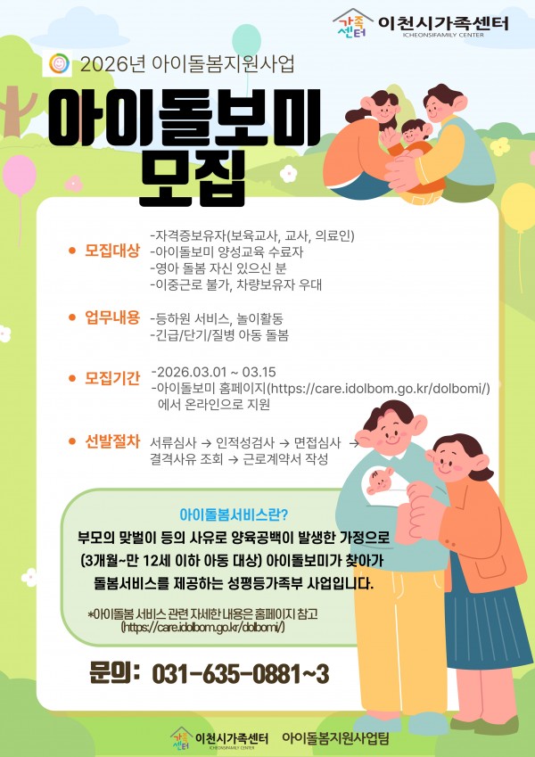 작성자 : 해정 | 작성일26-03-03 11:22 | 조회274회 | 댓글0건아이돌보미 선생님 모집