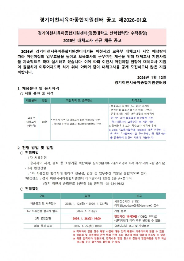 작성자 : 이천센터 | 작성일26-01-12 13:35 | 조회54회 | 댓글0건공고 제2026_01호_대체교사_채용_공고