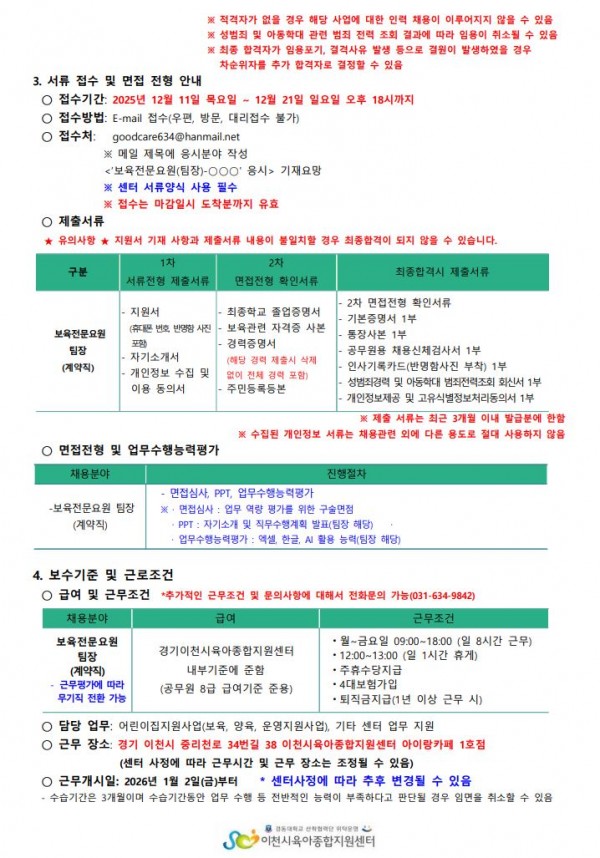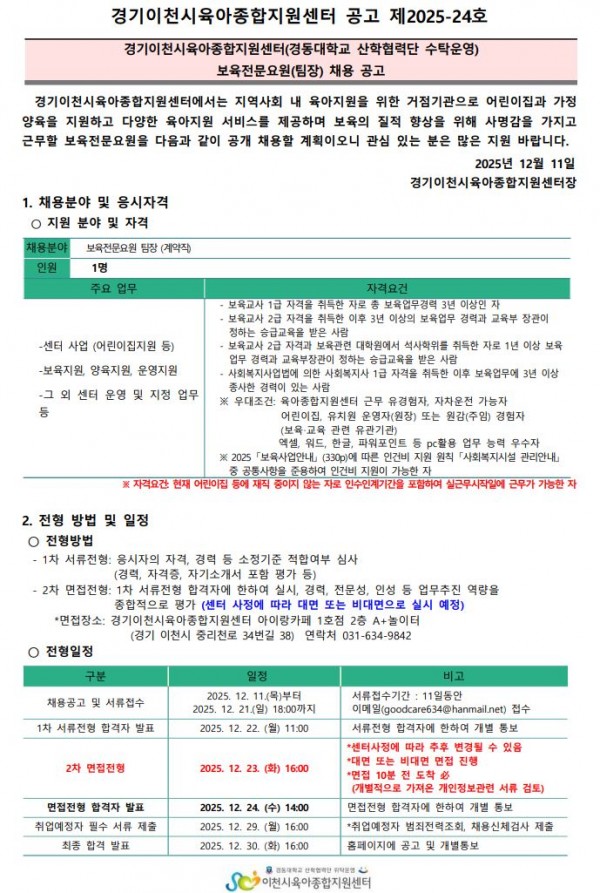 작성자 : 이천센터 | 작성일25-12-11 18:08 | 조회239회 | 댓글0건공고 제2025_24호_보육전문요원(팀장)_채용_공고