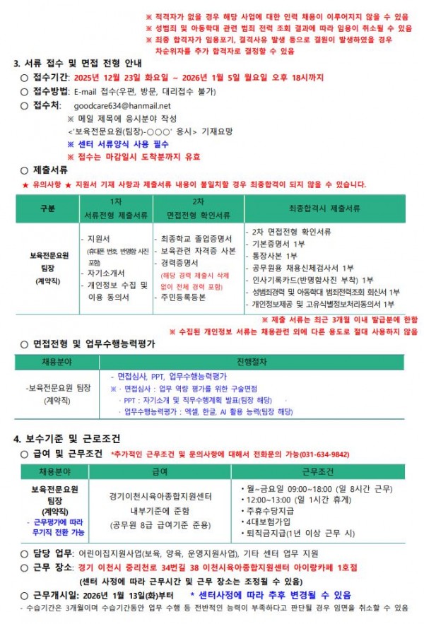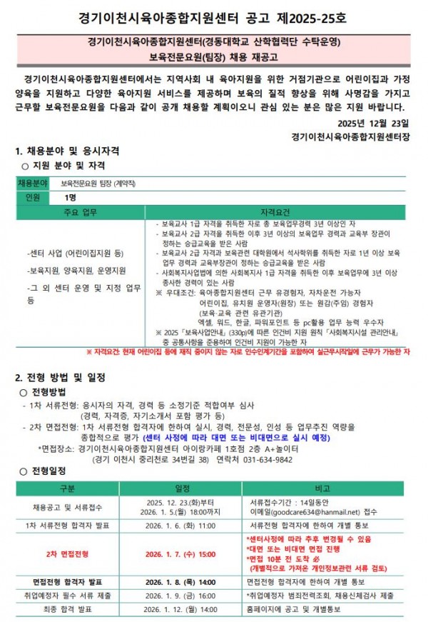 작성자 : 이천센터 | 작성일25-12-23 19:50 | 조회88회 | 댓글0건공고 제2025_25호_보육전문요원(팀장)_채용_재공고