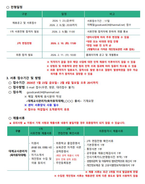 작성자 : 이천센터 | 작성일26-01-23 13:20 | 조회16회 | 댓글0건공고 제2026_06호_대체교사관리자(육아휴직대체)_채용_재공고