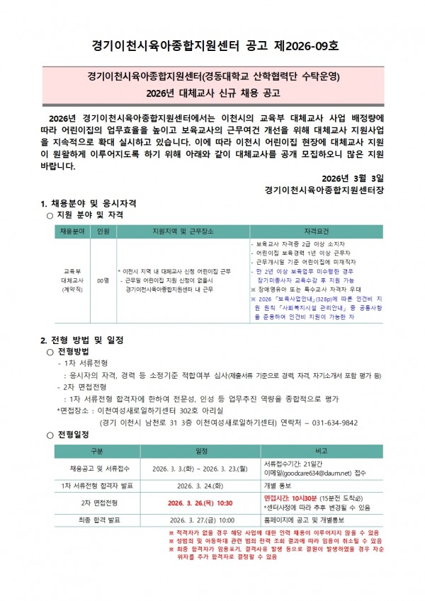 작성자 : 이천센터 | 작성일26-03-03 10:08 | 조회20회 | 댓글0건공고 제2026-09호_대체교사_채용_공고