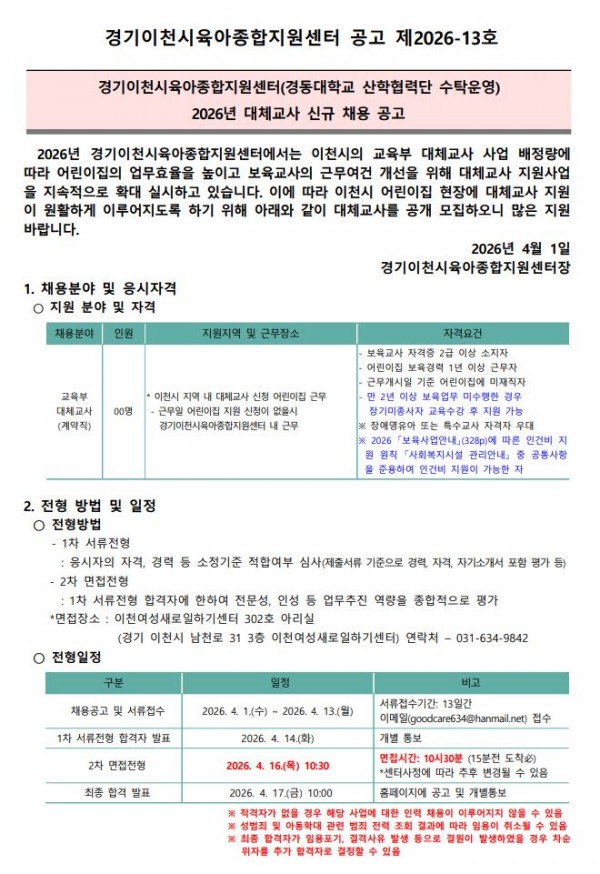 작성자 : 이천센터 | 작성일26-04-01 16:10 | 조회3회 | 댓글0건공고 제2026-13호_대체교사_채용_공고