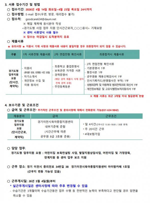 작성자 : 이천센터 | 작성일26-04-15 09:49 | 조회22회 | 댓글0건공고 제2026-19호 경기도형 사업 업무 지원 단시간 근로자 채용 재공고