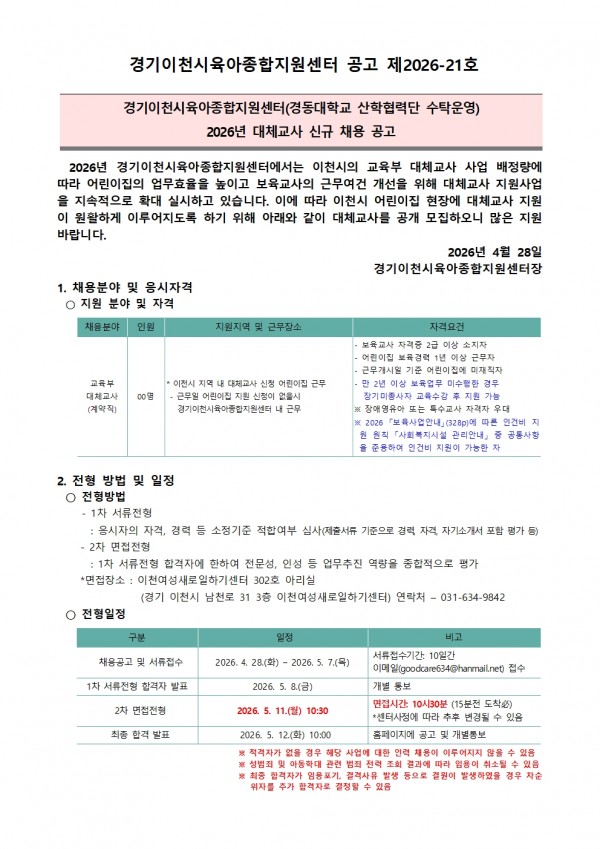 작성자 : 이천센터 | 작성일26-04-28 11:42 | 조회9회 | 댓글0건공고 제2026-21호_대체교사_채용_공고