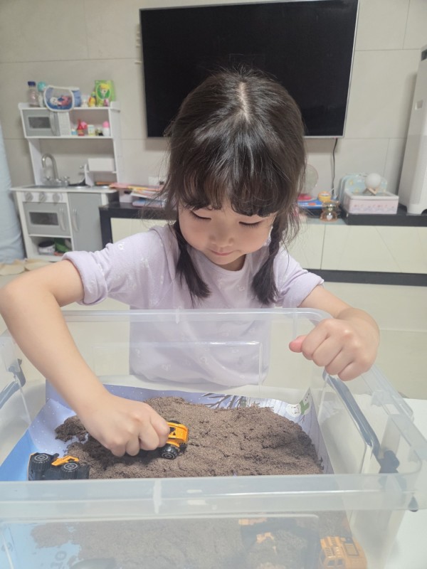 6살 딸아이가 포크레인, 덤프트럭으로 모래를 옮기며 한참을 집중해서 놀더라고요.